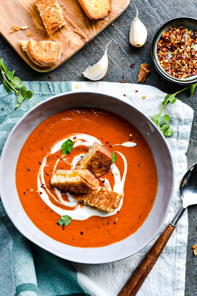 Easy Homemade Tomato Soup not only comes together in almost as much time as it takes to pop open a can of soup, but it also only takes a handful of ingredients that are pantry staples. Thick, hearty, and begging for dipping, this tomato soup is an instant classic.